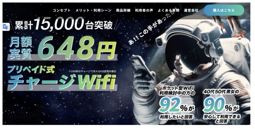 | プラン | 国内:100ギガ付きプリペイド式 チャージWi-Fi海外:チャージ式|プリペイド式 チャージWi-Fi |