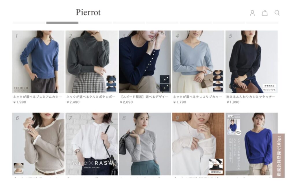 Pierrot(ピエロ)はシンプルで上質なファッションブランド。シンプルでベーシックなきれ いめアイテムが多いので、幅広い年齢層に年代でも着やすいブランドです。