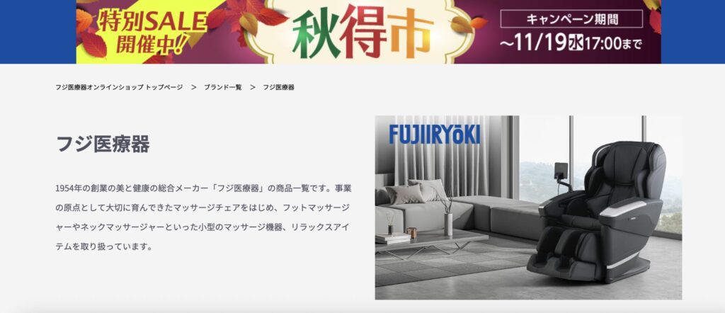 「フジ医療器オンラインショップ」では2025年11月19日(水)17:00まで、人気マッサージチェアやリラックスアイテムをお得に購入できる秋得市を開催中です。